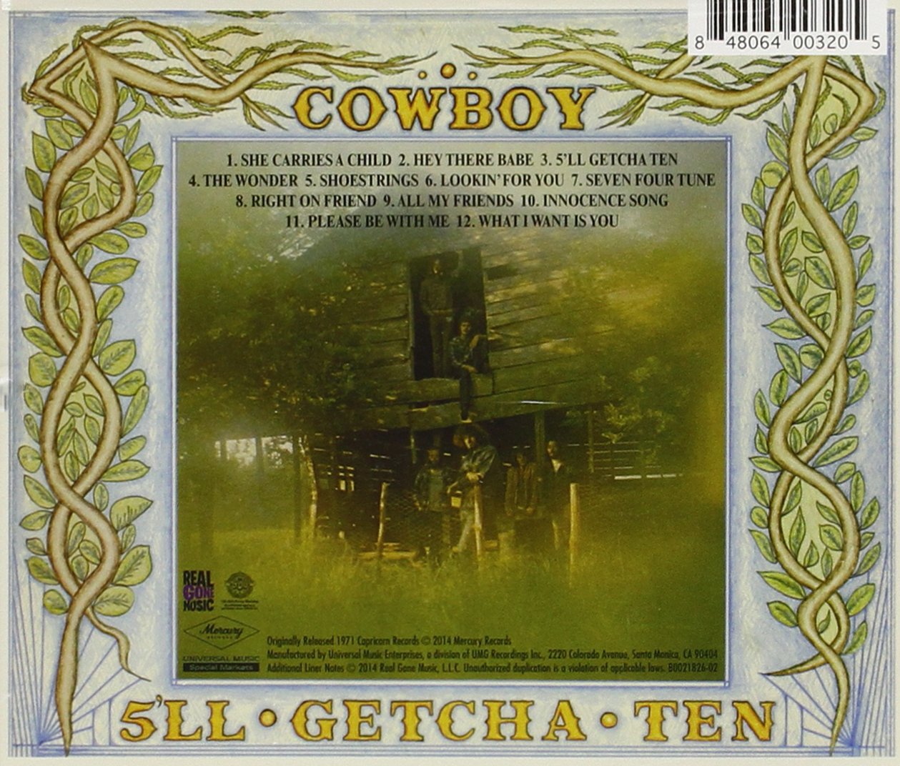 5'll Getcha Ten is the reissued of the worldwide debut album by Cowboy, was remastered and released on December 2, 2014 by Real Gone Music, from original in 1971 by Capricorn Records, featuring Duane Allman on Guitar and Dobro on a couple of tunes, and Chuck Leavell on Piano. The album is the Best Southern Rock and a Great Album of Acoustic Country Rock. For Fans of The Band, Gram Parsons, The Marshall Tucker Band.
