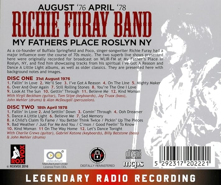 My Father's Place Roslyn NY, August '76, April '78 is the live album by Richie Furay Band, was released on April 22, 2016 by RoxVox, recorded live at My Father's Place, Roslyn, New York Broadcast on WLIR-FM over two performances August 31, 1976 and August 18, 1978.