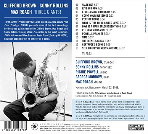Three Giants is the collection album by Clifford Brown, Sonny Rollins, Max Roach, originally released by Prestige Records), digitally remastered and released on May 25, 2018 by Jazz Images, featuring Sonny Rollins, Max Roach, Richie Powell, and George Morrow.