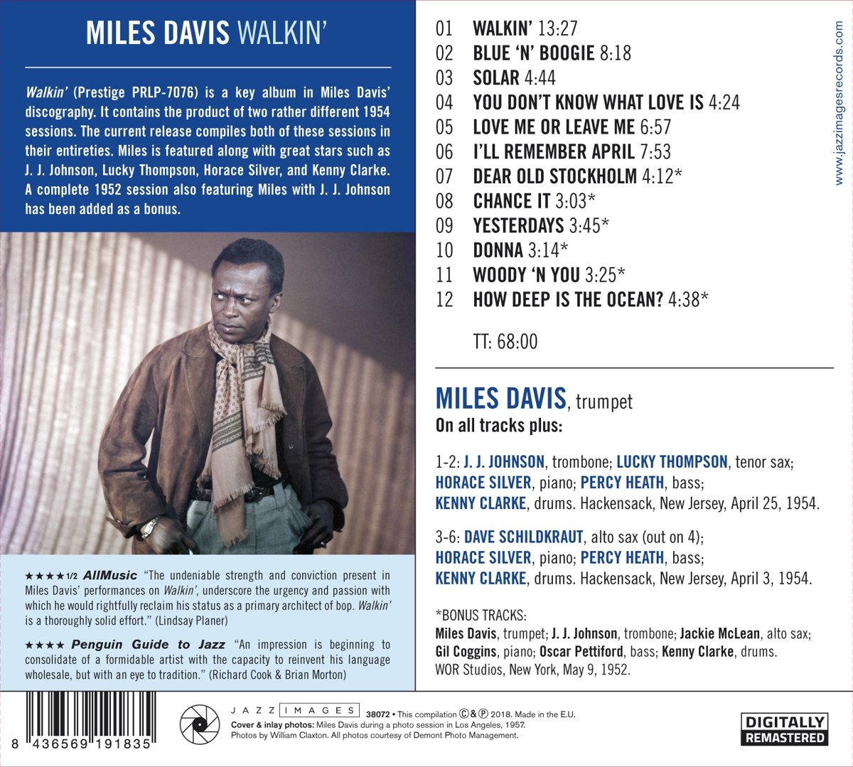 Walkin' is one of the collection album by Miles Davis, originally released on June 1957 by Prestige, digitally remastered and reissued on May 25, 2018 by Jazz Images, featuring Lucky Thompson, J.J. Johnson, Horace Silver, Percy Heath, Kenny Clarke, David Schildkraut, Jackie McLean, Gil Coggins and Oscar Pettiford.