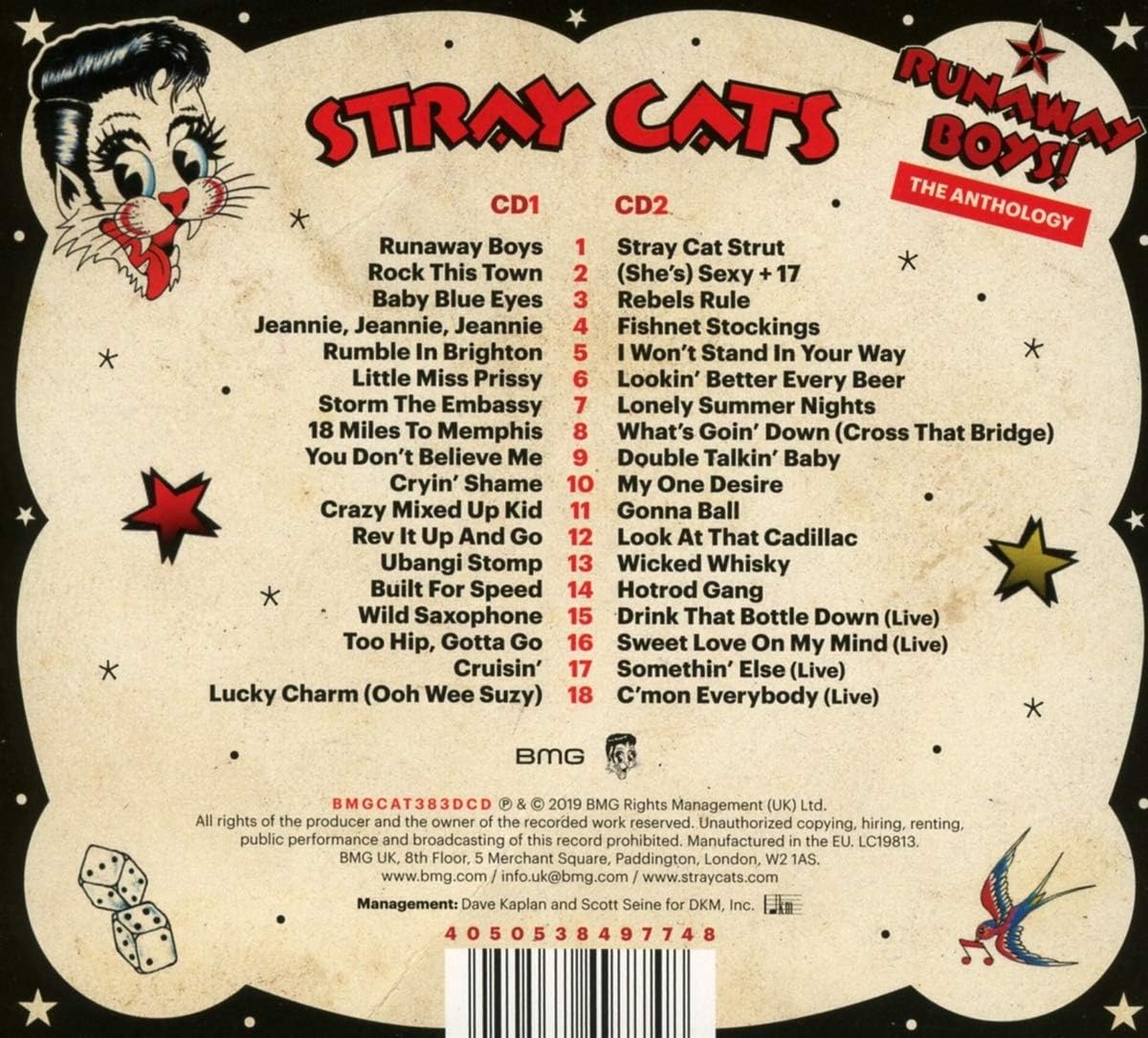 Runaway Boys! (The 40th Anniversary Anthology) is the anniversary album by Stray Cats, released on September 27, 2019 by BMG Rights Management. 36 (CD) of the Stray Cats most rockin' cuts, featuring "Stray Cat Strut", "Rock this Town", "Runaway Boy" and "(She's) Sexy + 17", includes new interview with Brian Setzer.