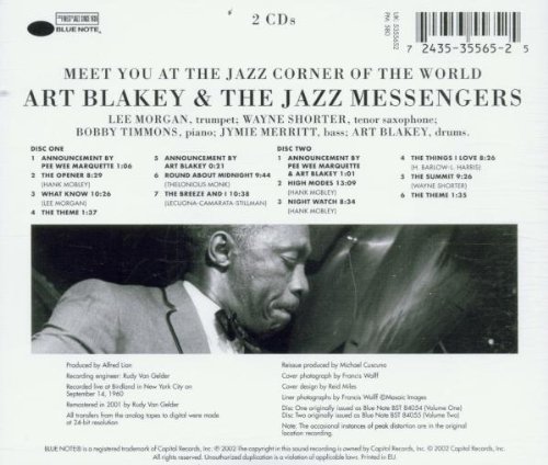 Meet You At The Jazz Corner Of The World Vol. 1 is a live album by Art Blakey And The Jazz Messngers, originally released in 1960 by Blue Note Records, remastered and reissued on November 15, 2019 by Blue Note Records, recorded at Birdland, a Jazz Club in New York City, September 14, 1960. Featuring Lee Morgan, Wayne Shorter, Bobby Timmons, and Jymie Merritt.