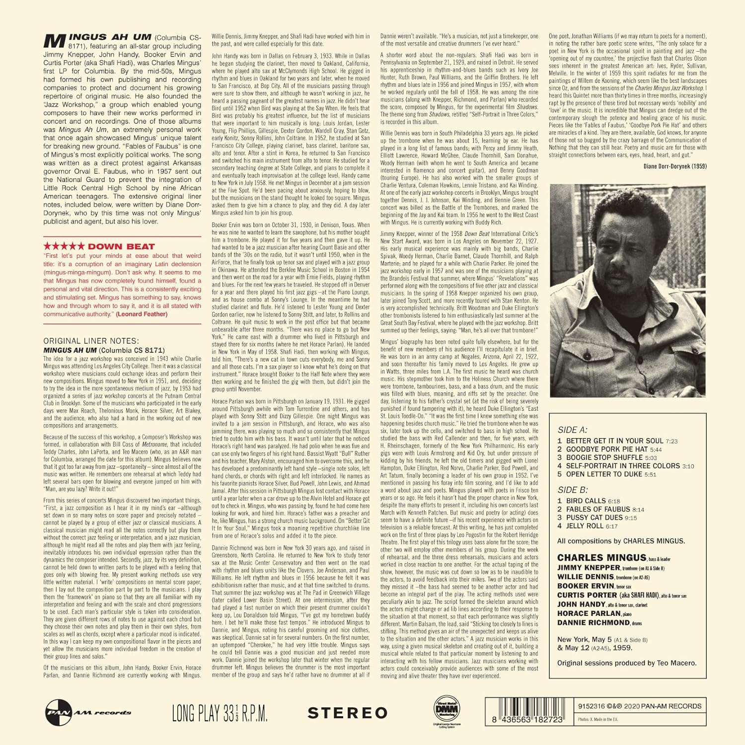 Minus Ah Um is a studio album by Charles Mingus, originally released on October, 1959, by Columbia Records, remastered and reissued on February 14, 2020 by Pan Am Records. Limited Edition 180 Gram Virgin Vinyl.