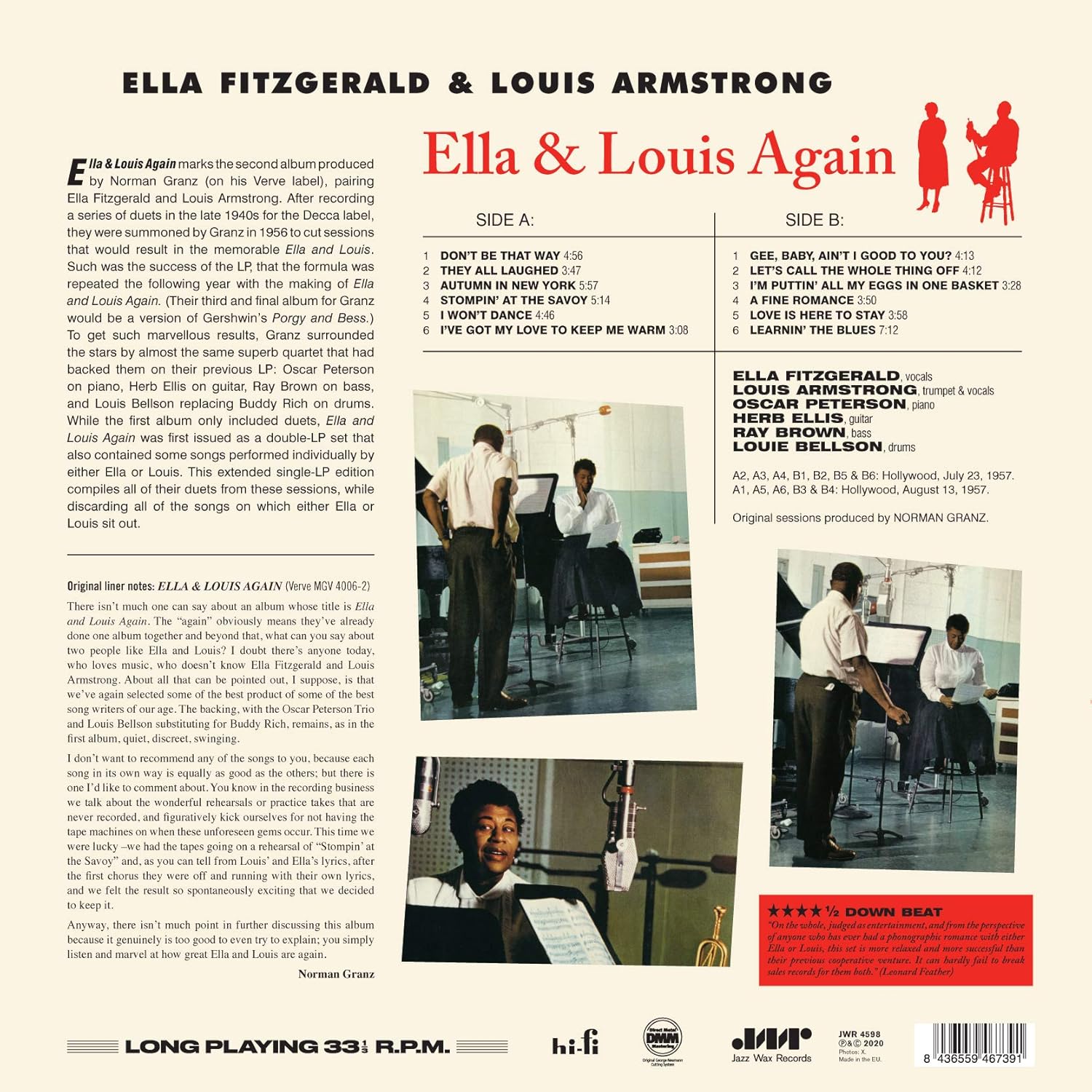 Ella & Louis Again is an album by Ella Fitzgerald & Louis Armstrong, originally released on October, 1957 by Verve Records, remastered and reissued on February 14, 2020 by Jazz Wax Records. Limited Edition 180 Gram pure virgin vinyl.