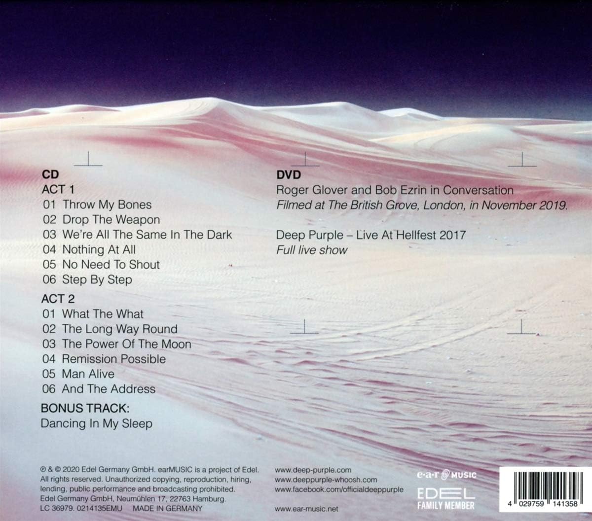 Whoosh! is the twenty-first studio album by Deep Purple, released on August 7, 2020 by earMusic. Limited Edition including the Full Live Show at Hellfest 2017 and 60 minutes video special Roger Glover and Bob Ezrin in Conversation, in 2019.