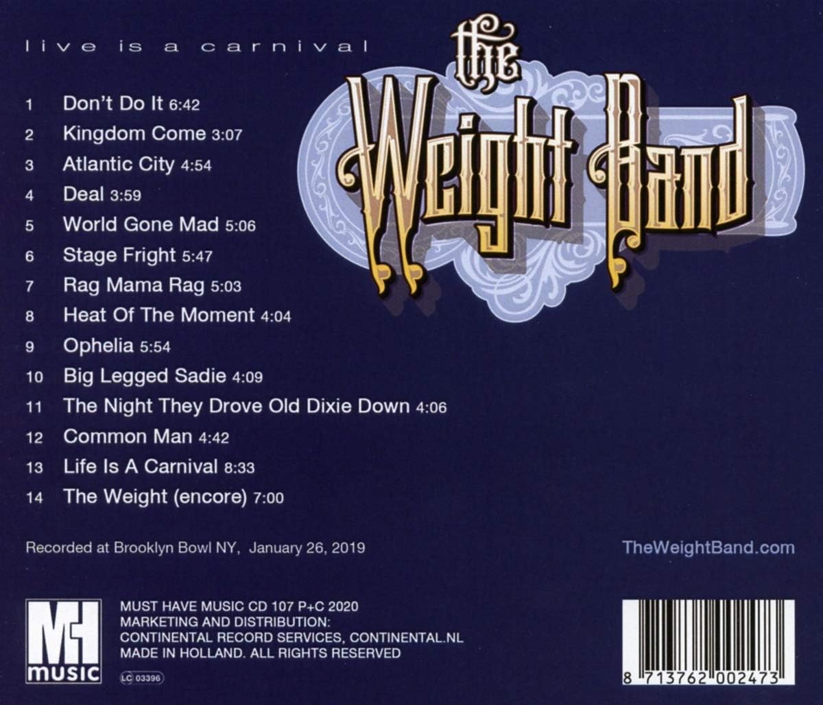 The Weight Band are an American Rock Band, formed 2013 inside the famed Woodstock, New York barn of Levon Helm when Jim Weider and Randy Ciaelante, both former members of The Band-performed "Song Of The Band" with Band Founder Garth Judson, alongside Jimmy Vivino and Byron Isaacs, and inviting Brian Mitchell and Marty Grebb to complete their sound The Weight Band later added Albert Rogers, Michael Bram and Matt Zeiner to make up their current line-up.