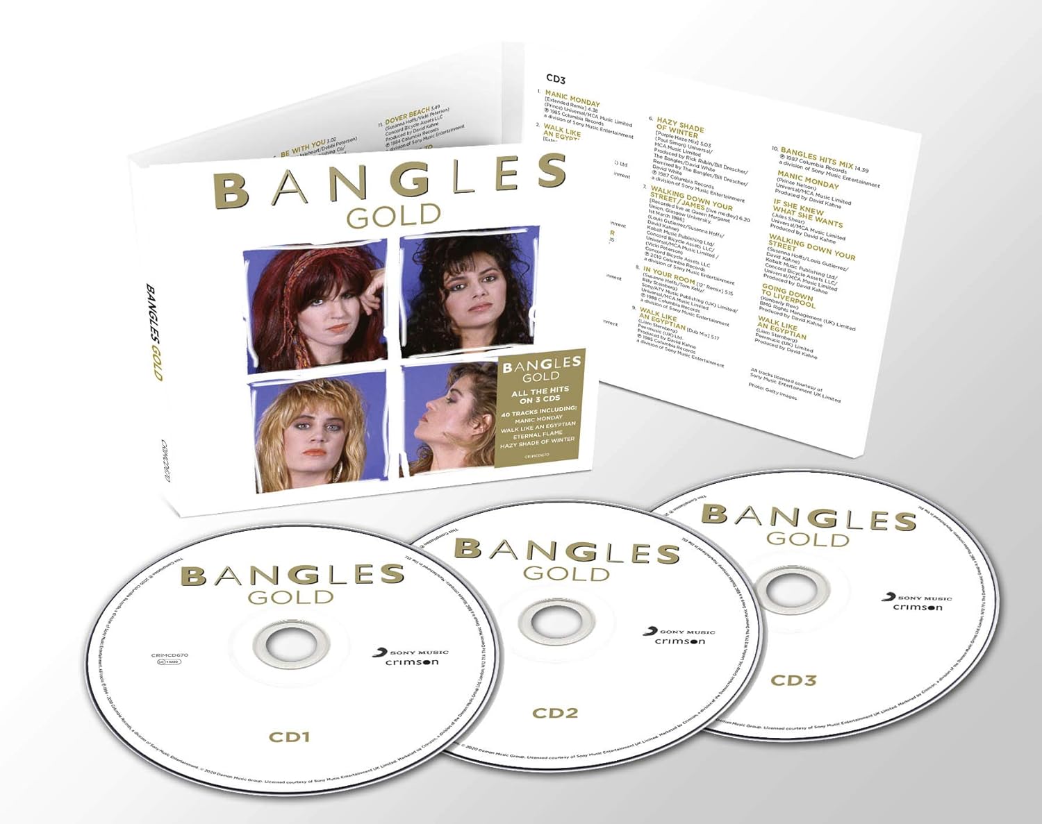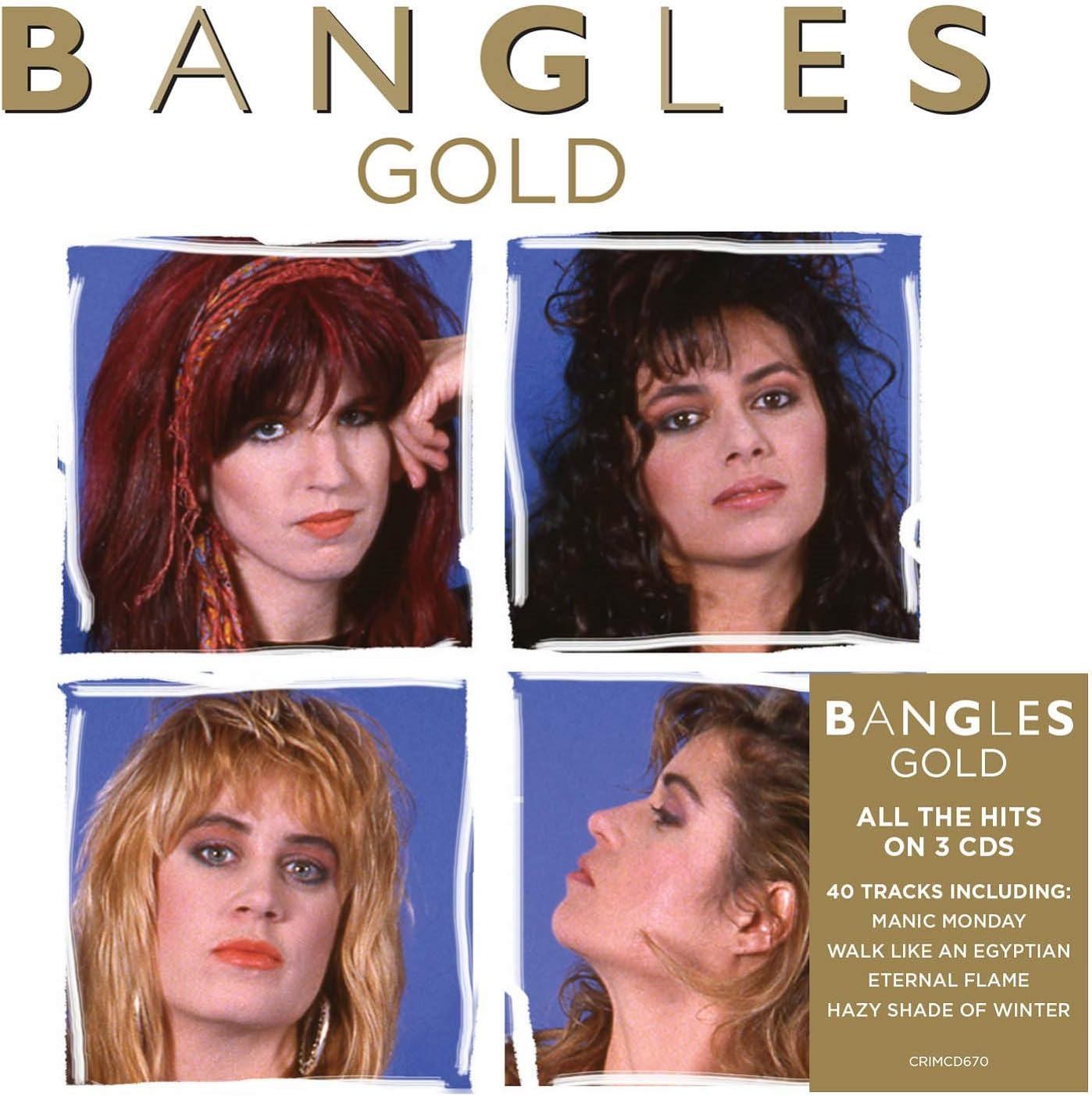 Bangles: Gold is the compilation album by The Bangles, released on October 2, 2020 by Crimson Productions. All The Hits on 3 CD, 40 Tracks including "Manic Monday", "Walk Like An Egyptian", "Eternal Flame", "Hazy Shade Of Winter", and more!.