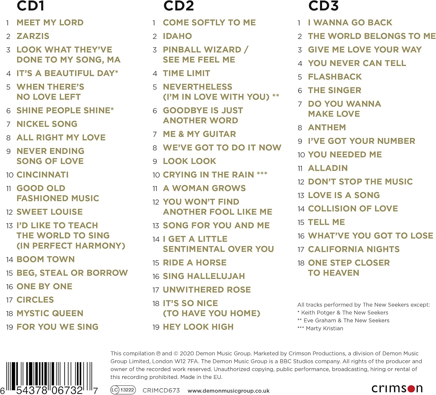 The New Seekers: Gold is the compilation album by The New Seekers, released on September 18, 2020 by Crimson Productions. All The Hits on 3 CD, 56 Tracks, including "I'd Like To Teach The World To Sing (In Perfect Harmony)", "Beg Steal Or Borrow", "You Won't Find Another Fool Like Me" and more!.