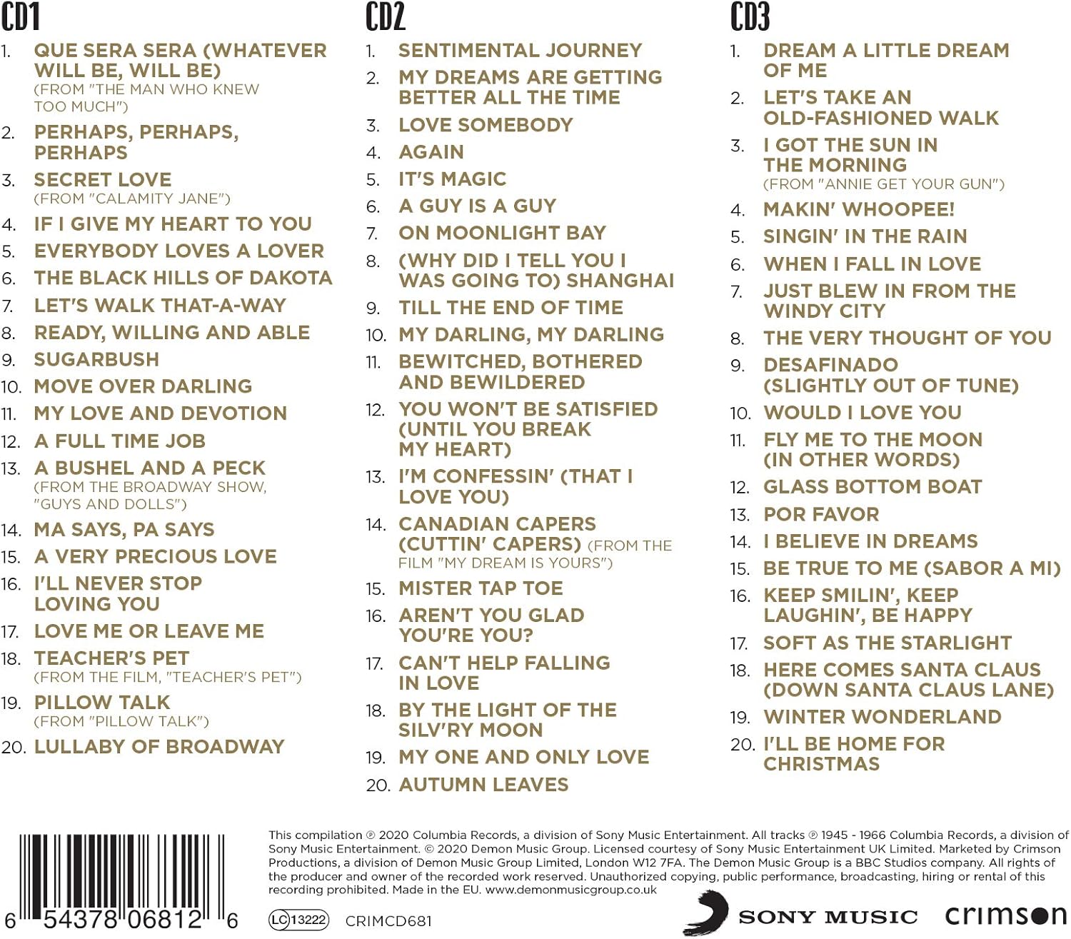 Gold is the compilation album by Doris Day, released in 2020 by Crimson, 60 Tracks, including "Que Sera Sera (Whatever Will Be, Will Be), "Perhaps, Perhaps, Perhaps", "Secret Love", "Dream A Little Dream Of Me' and many more!.