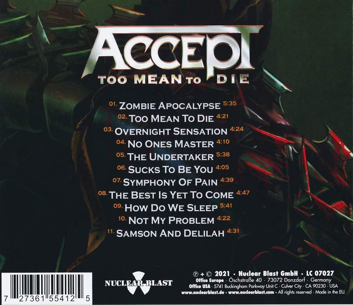 Too Mean To Die is the sixteenth studio album by Accept, released January 2021 by Nuclear Blast. Great Album!.