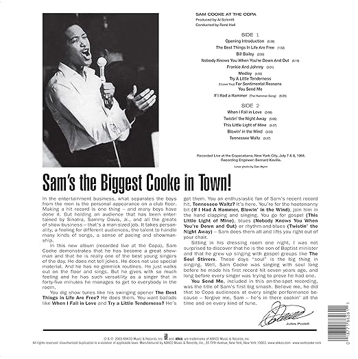Sam Cooke At The Copa is a live album by Sam Cooke, originally released on October 1964 by RCA, remastered and reissued on January 22, 2020 by RCA, recorded live at the Copacabana, New York City, July 7& 8, 1964.