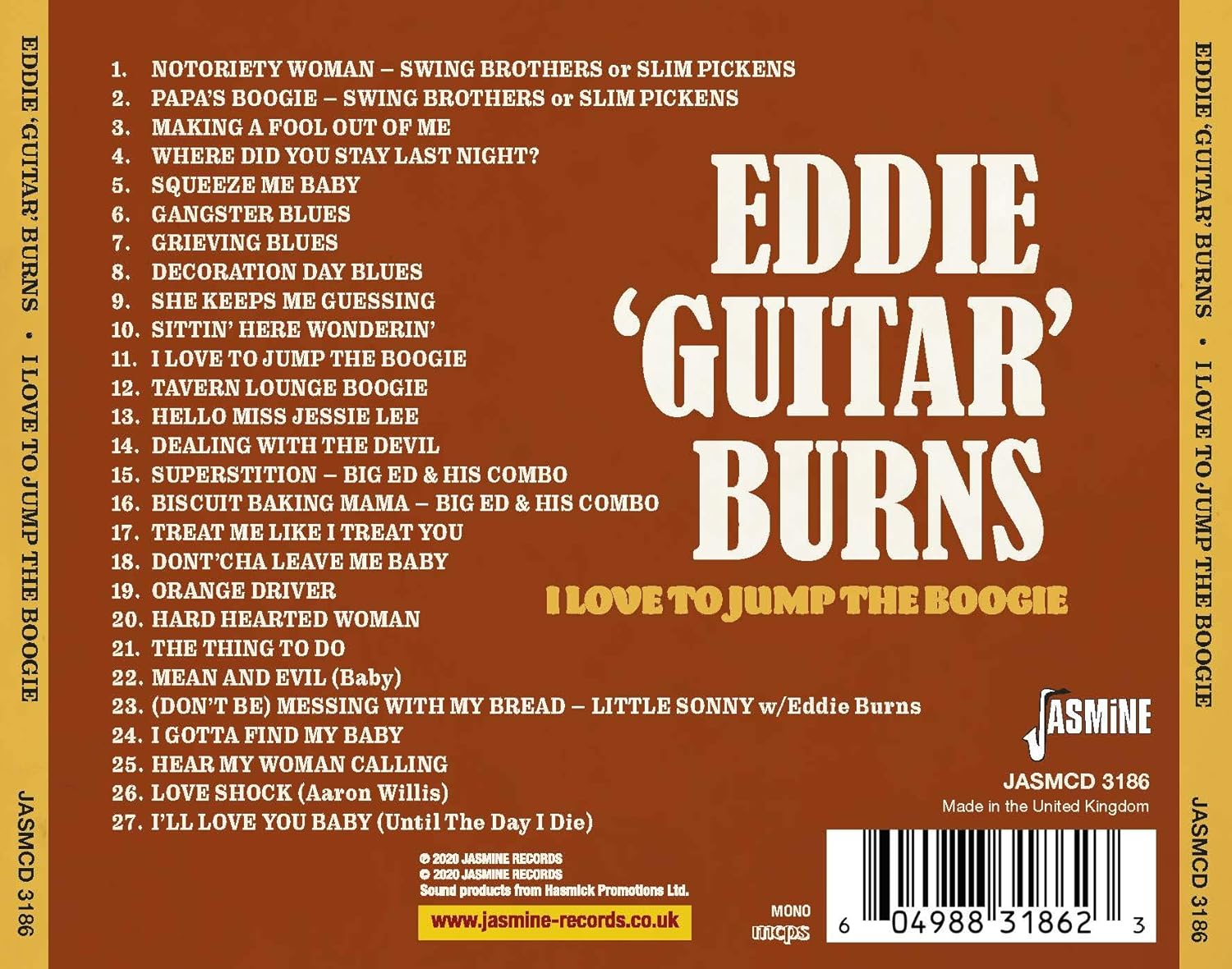 I Love To Jump The Boogie is the compilation album by Eddie Burns, released on March 21, 2021 by Jasmine Records.