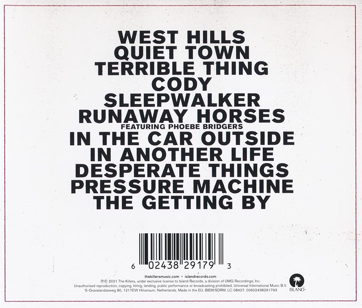 Pressure Machine is the seventh studio album by The Killers, released on August 13, 2021 by Island Records. The album reached No. 1 on US Folk Albums Billboard Chart/US Top Rock Albums Billboard Chart/UK Albums Chart/Scottish Albums Chart.