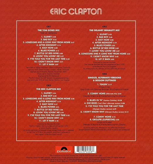 Eric Clapton is the Anniversary Deluxe Edition of the debut studio album by Eric Clapton, originally released on August 16, 1970 by Atco Records. Deluxe Edition remastered and reissued on June 9, 2021 by Polydor Records, featuring all 3 vintage 1970 mixes of the album including the Eric Clapton Mix, Singles, Alternate Mixes and Outtakes, New Artwork with 24 page book.