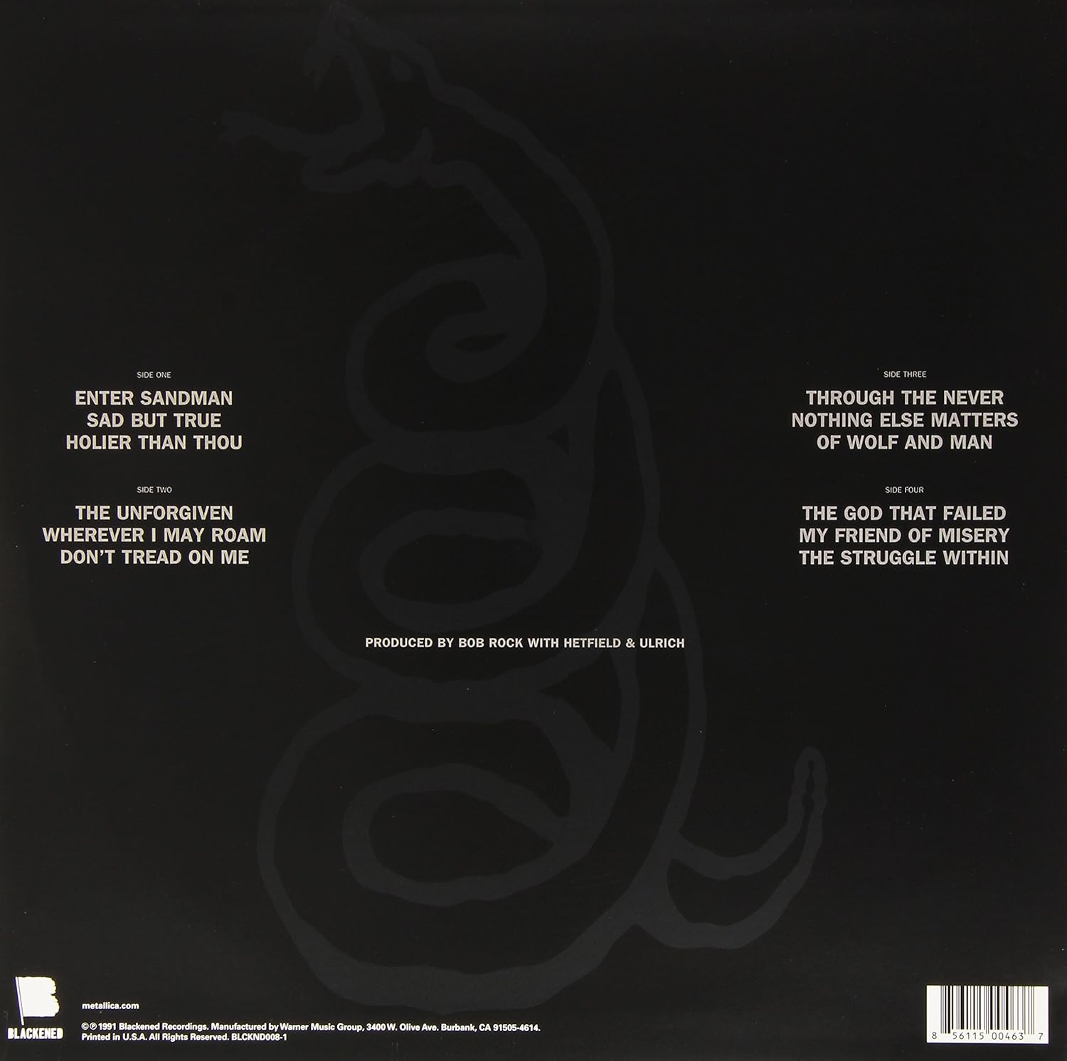 Metallica is the fifth studio album by Metallica, originally released on August 12, 1991 by Elektra Records, remastered and reissued on July 30, 2021 by Blackened Recordings. The Top-Selling album of the past 30 Years!, over 30 Million Worldwide Sales, featuring "Enter sandman", "Nothing Else Matters, "The Unforgiven", "Wherever I May Roam", and Sad But True. On 180 Gram Vinyl.