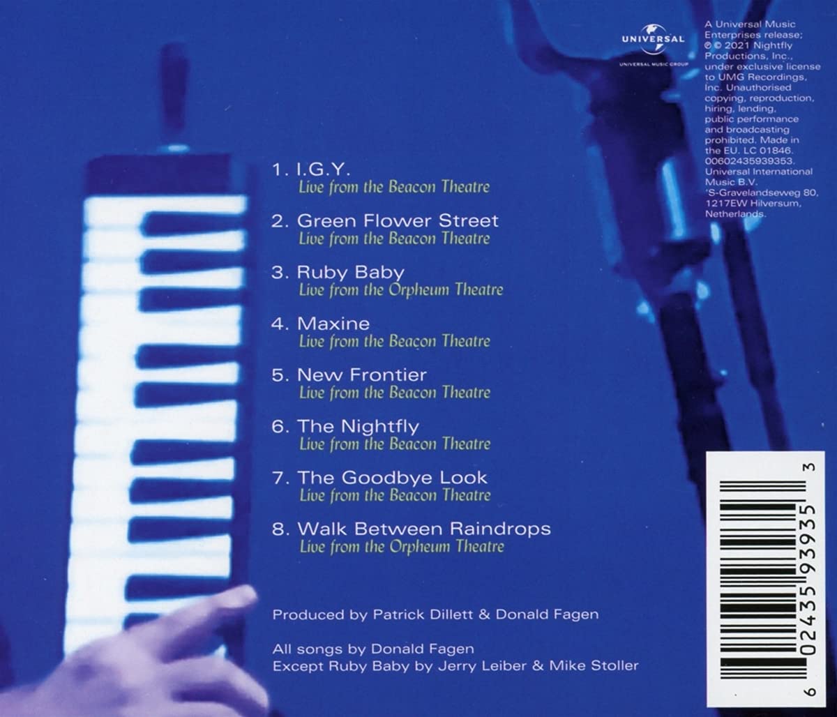 Donald Fagen's The Nightfly Live is a live album by Donald Fagen, released on September 24, 2021 by UMe, captures a 2019 performance of the 1982 album by Steely Dan Band, as he choose to all them in the years following Walter Becker's 2017 death., recorded live from The Beacon theatre and live from The Orpheum Theatre.