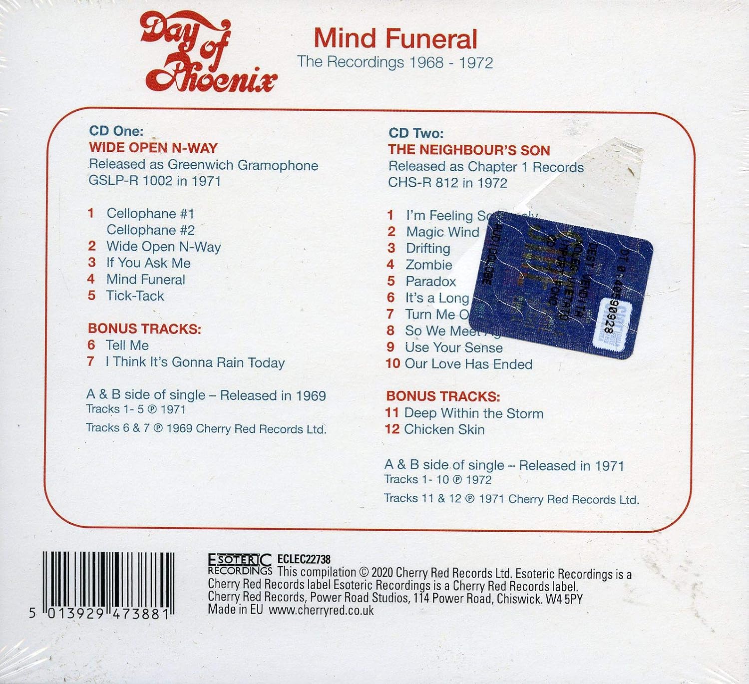 Mind Funeral - The Recordings 1969-1972 is a new remastered collection of all the recordings by Day Of Phoenix, released on December 8, 2020 by Esoteric Recordings, remastered from the original chapter one records master tapes, includes a booklet.