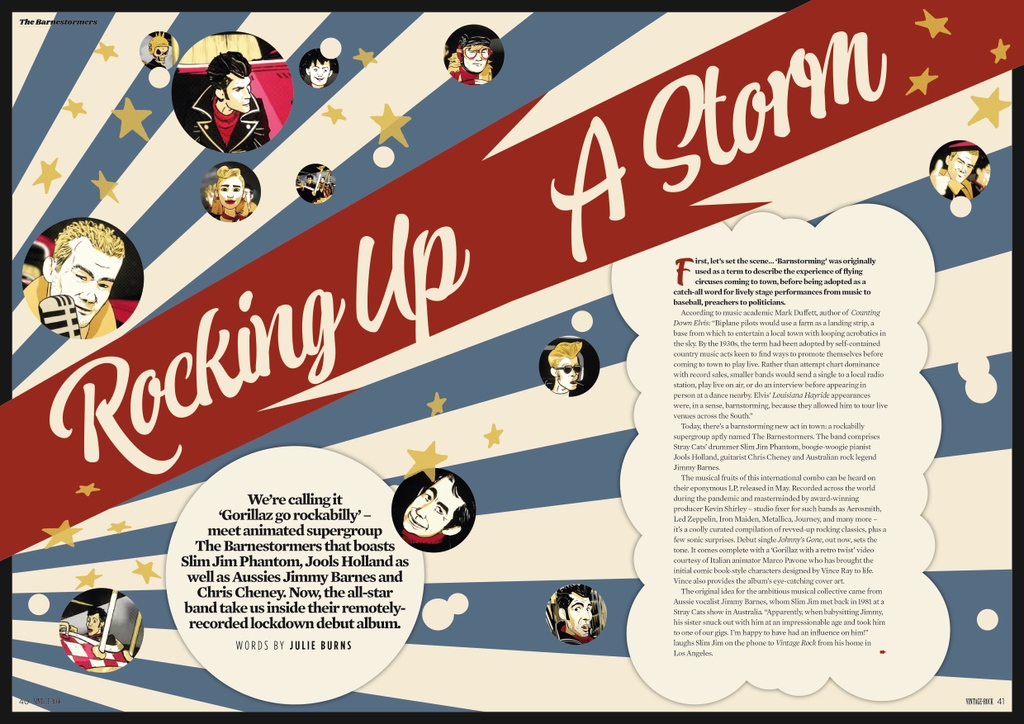The Barnestormers are an American Rockabilly Supergroup, formed in 2023 by Jimmy Barnes (Vocals), Chris Cheney (Guitar of The Living End), and Slim Jim Phantom (Drums from Stray Cats), along with Kevin Shirley (Bass from The Caveman), and Jools Holland (Piano).