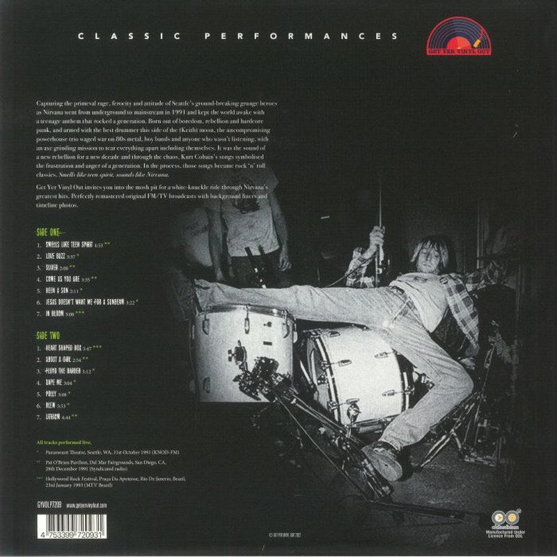 Greatest Hits...Live is a live collection album by Nirvana, released on June 8, 2021 by Get Yer Vinyl Out, recorded live from Paramount Theatre, Seattle, WA, October 31 by 1991(KNOD-FM). Deluxe Gatefold Edition 180 Gram Vinyl.