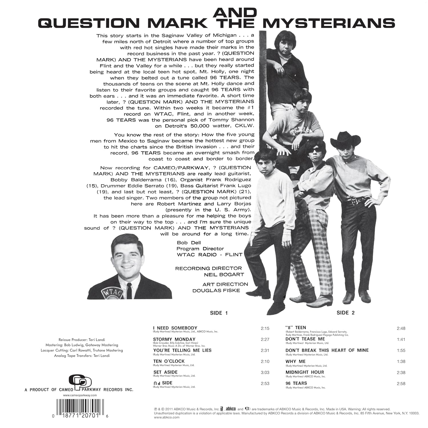 96 Tears is the debut studio album by Question Mark And The Mysterians, originally released on November, , 1966 by Cameo Parkway Records, remastered and reissused on November 25, 2022 by ABKCO Music & Records. For Music Lovers and Music Collectors.