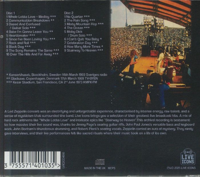Greatest Hits Live Broadcast Collection is a live album by Led Zeppelin, released on January 24, 2025 by Live Icons, recorded live from Korserthuset, Stockholm, Sweden, March 14, 1969 Sveriges Radio, Gladsaxe Copenhagen, Denmark, March 17, 1969, TV-BYEN, and Kezar Stadium, San Francisco, CA, June 2, 1973 KMPX-FM. For Fans of Led Zeppelin.