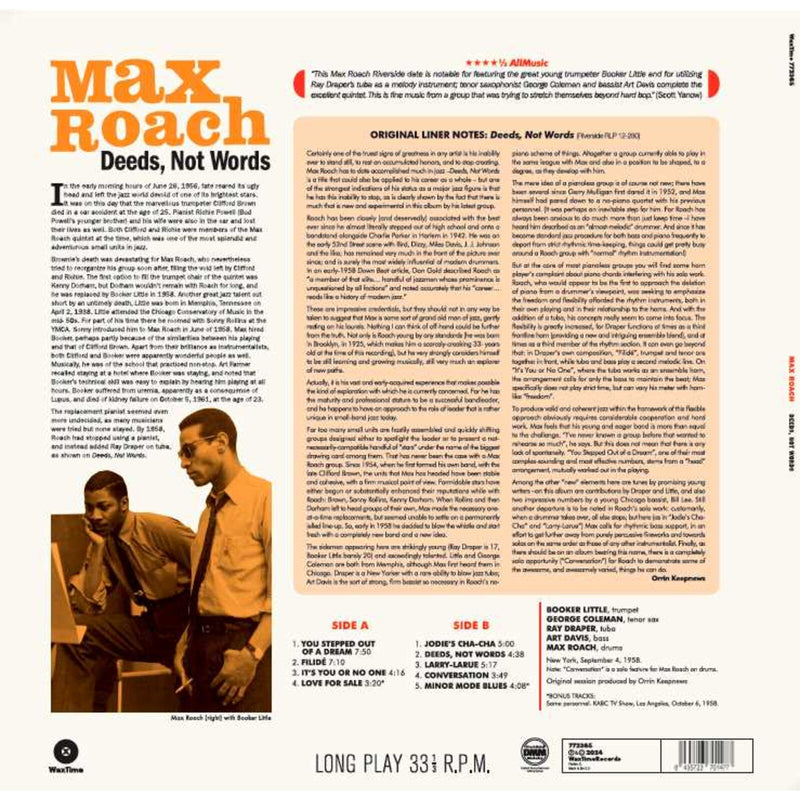 Deeds, Not Words is an album by Max Roach, originally released in 1958 by Riverside Records, remastered and reissued on January 17, 2025 by WaxTime. Limited Edition 180 Gram Audiophile Vinyl.