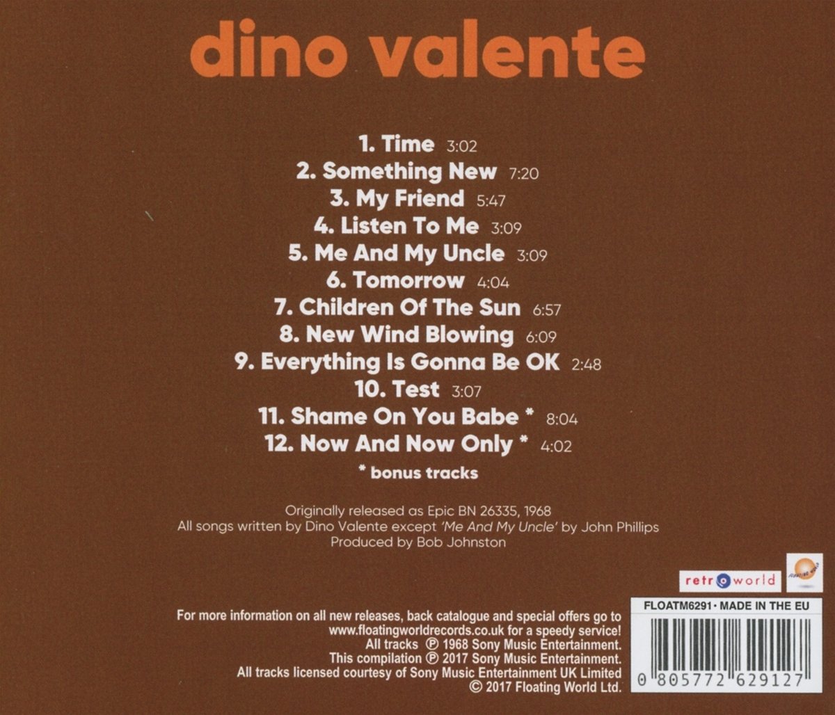 Dino Valente is the sole album by Dino Valente , originally released on August 1968 by Epic Records, remastered and reissued on January 28, 2017 by Floating World. For Music Collectors.