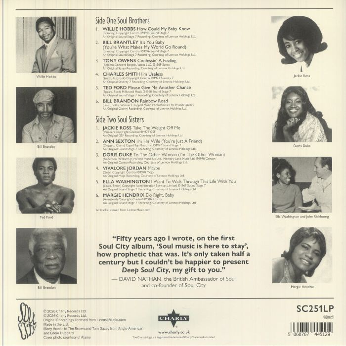Deep Soul City is the compilation and collection album by Various Artists, to celebrating Soul City historic association with Deep Soul of 60th Anniversary, released on January 30, 2026 by Soul City Records. Limited Edition 140 Gram ,12" Black Vinyl.